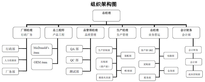 公司設(shè)有壓煉部、噴油部、裝配部、倉務(wù)部、行政部、廠務(wù)部、人力資源部、會(huì)計(jì)部、品管部、測試部